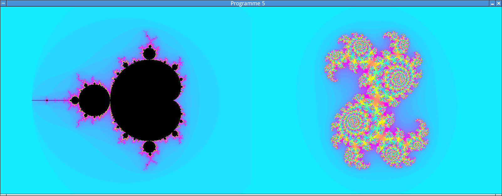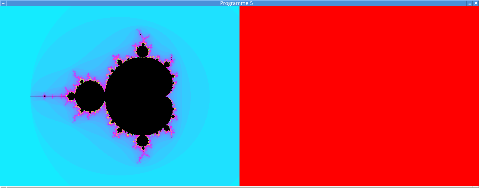 Modifiez votre dernier programme de façon à ce qu’il crée une fenêtre de 1600 x 600 pixels. Ce programme doit continuer à afficher l’ensemble de Mandelbrot dans la moitié gauche de cette fenêtre.